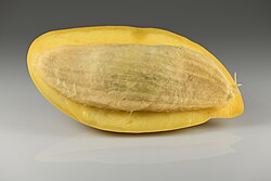 Манго — это плоды одноименного индийского растения. Их кожура может иметь оттенки красного, зелёного или жёлтого, в то время как мякоть всегда окрашена в жёлто-оранжевые тона. В центре каждого плода расположена овальная косточка. Размеры манго варьируются от 6 до 25 сантиметров, а вес может достигать 2 килограммов[3].