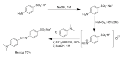 - К охлаждённому раствору приливают полученный выше раствор диазобензолсульфокислоты (C6H4N2O3S). Во время химической реакции начинается образование метилоранжа — натриевой соли 4′-диметиламиноазобензол-4-сульфоновой кислоты.