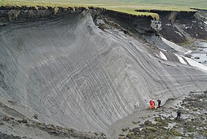 Протаивание ледяных включений вызывает образование различных форм термокарстов: просадок, воронок, округлых впадин. Приводит к образованию поверхностных оползней (сплывов) и грунтовых потоков (солифлюкция)[2].