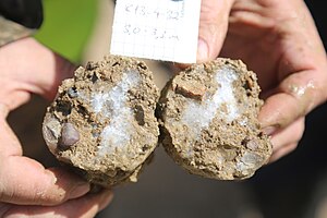 - Глины, суглинки, супеси и торф: лёд присутствует в виде слоёв или сетки.
