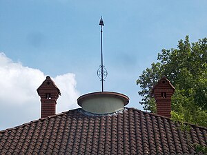 Современные исследования показали, что эта система представляла собой ранний вариант громоотвода: молнии, ударявшие в башню, притягивались к заострённым шипам шара и ток разряда уходил по металлическим стержням внутри башни в грунт[18]. На сохранившихся фрагментах того «шара-солнца» до сих пор видны оплавленные отверстия и разрушенные шипы — следы сильнейших ударов молнии, перенесённых башней без катастрофических последствий[18].