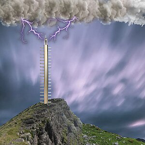 Тем не менее официальным изобретателем молниеотвода считается американский учёный Бенджамин Франклин, который в 1752 году провёл знаменитый опыт с запускаемым в грозу воздушным змеем и смог доказать электрическую природу молнии[18]. В том же году Франклин предложил использовать заземлённый металлический стержень на крыше здания для защиты от молнии[20].