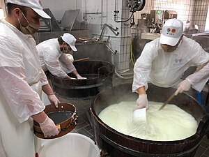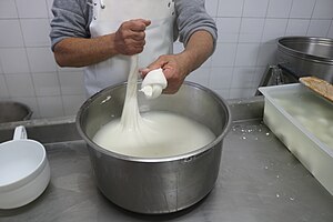 В начале производственного процесса пастеризованное или сырое молоко подвергается ферментации с использованием термофильных молочнокислых бактерий, после чего для створаживания добавляется сычужный фермент. Иногда могут применяться хлорид кальция или раствор лимонной кислоты[2].