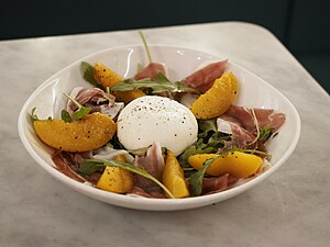 В кулинарии моцареллу, особенно свежую, чаще всего применяют в салатных композициях, где она ценится не столько за вкус, сколько за придание специфической текстуры. Наиболее популярным примером является салат капрезе, где моцарелла гармонично сочетается с помидорами и базиликом, визуально формируя цвета итальянского флага (зелёный, белый и красный)[2].