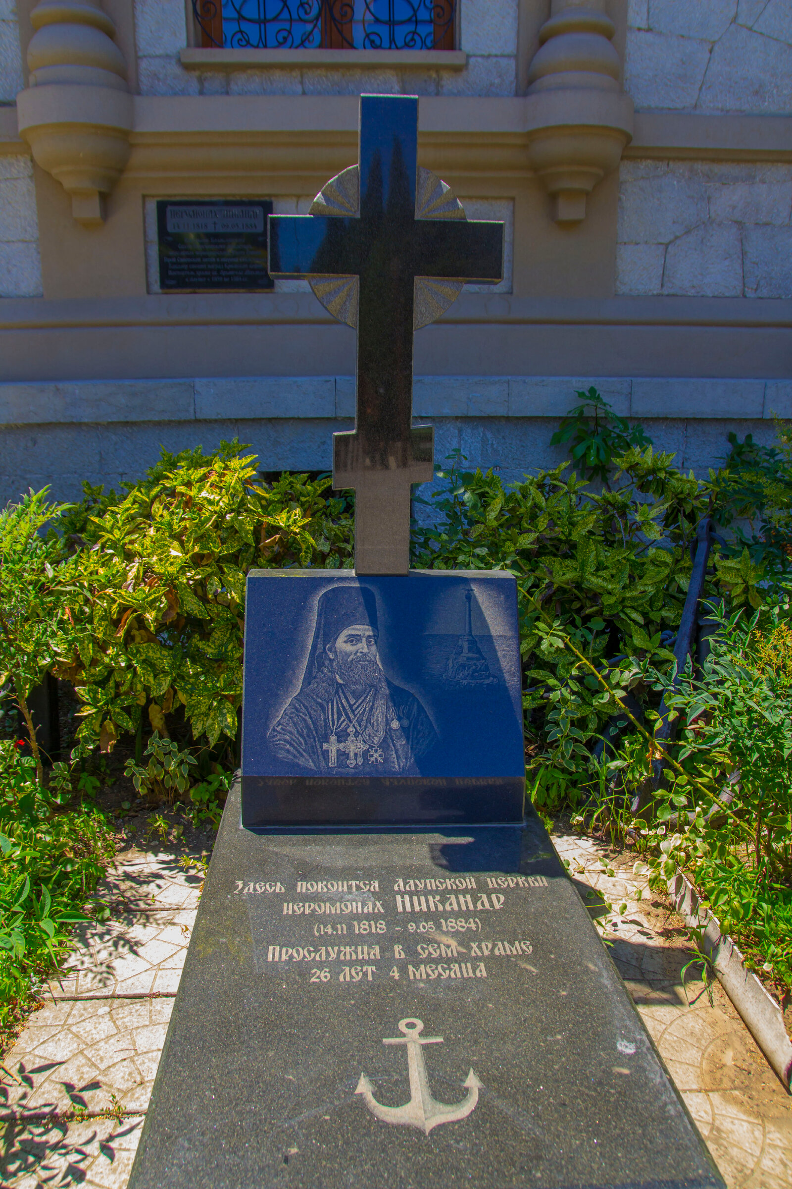 «9 мая скончался, 12-го предан земле заведующий Архангело-Михайловской церковью в местечке Алупке, Балаклавского-Георгиевского монастыря иеромонах Никандр — 66 лет, от порока сердца. Исповедовал и приобщал протоиерей Сердюков. Похоронен соборне в восточной стороне Алупской церкви в ограде».