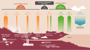 Закись азота (N₂O) представляет собой важный компонент атмосферы, и в 2020 году её концентрация достигла 535 частей на миллиард, увеличиваясь примерно на одну часть на миллиард в год. Этот газ является основным поглотителем стратосферного озона, и его воздействие на озоновый слой сравнимо с воздействием хлорфторуглеродов (ХФУ). Анализ данных за десятилетие, закончившееся в 2016 году, показывает, что около 40% выбросов закиси азота в атмосферу, составляющих 17 тераграммов азота в год, связаны с деятельностью человека. Рост выбросов обусловлен расширением сельского хозяйства и развитием промышленности в странах с развивающейся экономикой[9].