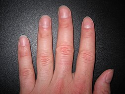 | Обкусанные ногти и кутикула | Лейконихия (лат. Leucomiquia), ноготь с большим пятном | Отслоение ногтей на левой руке у 34-летнего мужчины |
