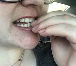 Онихофаги́я (от греч. др.-греч. ὄνυξ — «ноготь» и др.-греч. φαγείν — «есть») — психогенное расстройство поведения, проявляющееся в навязчивом обкусывании ногтей и кожи вокруг них. Часто возникает в детском и подростковом возрасте, но нередко сохраняется во взрослом периоде. Состояние находится на границе между вредной привычкой и психическим расстройством, поскольку может сочетаться с тревожностью и навязчивыми действиями. Это повторяющееся поведение, часто связанное с тревожностью, скукой или внутренним напряжением[2].