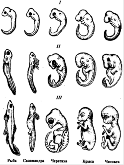 - Уменьшение сходства: по мере развития зародыш становится всё менее похожим на зародыши других видов и не проходит через их поздние стадии развития.