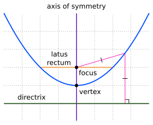 Геометрически парабола представляет собой незамкнутую симметричную кривую с одной осью симметрии, которая проходит через фокус перпендикулярно директрисе. Вершина параболы — точка пересечения кривой с осью симметрии; она расположена ровно посередине между фокусом и директрисой[1].