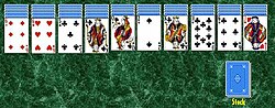 В игре задействованы две колоды карт по 52 штуки (всего 104). 54 карты сначала раскладываются на десять столбцов по пять или шесть карт в каждый. В первые четыре стопки раздаётся по шесть, а следующие шесть столбцов раздаётся по пять. Оставшиеся 50 карт делятся на пять равных стопок и выкладываются в нижнем правом углу. Все карты сдаются «рубашкой» вверх, кроме последней, которая выкладывается лицевой стороной к игроку[3].