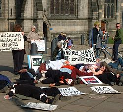 Пацифисты применяют разнообразные формы протеста против войны и насилия, включая такие нестандартные методы, как Die-in (имитация смерти)[10].