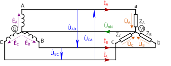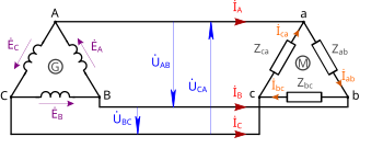 Трехфазная система была изобретена и разработана во всех деталях, включая трехфазные трансформатор и асинхронный двигатель, выдающимся русским инженером М. О. Доливо-Добровольским (1862—1919) в 1891 году[8]. Трёхфазные электрические цепи представляют собой объединение трёх независимых источников синусоидального переменного тока одинаковой частоты и напряжения. Объединяемые источники принято называть фазами, так что понятие «фаза» имеет два значения: