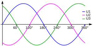 Фазы сдвинуты друг относительно друга на угол 120° (см.диаграмму ниже). В зависимости от конфигурации сети возможны два вида соединений: «звезда» и «треугольник»[8].