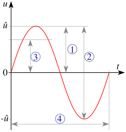 В силу того, что переменный ток меняется как по величине, так и по направлению, то одно из направлений переменного тока в цепи условно считают положительным, а другое отрицательным. Соответственно, значения тока в зависимости от того, в каком из направлений они рассматриваются, также называются положительными или отрицательными. Величина переменного тока, соответствующая данному моменту времени, называется его мгновенным значением, а максимальное мгновенное значение переменного тока, которого он достигает в процессе своего изменения в любом из направлений, называется амплитудой тока. Кроме того, периодический переменный ток характеризуется периодом — наименьшим отрезком времени , в течение которого любые его значения повторяются. Если форма тока симметрична относительно оси времени, то среднее значение силы тока и напряжения за период равно нулю[3].