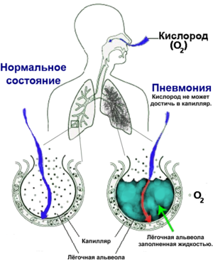Пневмони́я (др.-греч. πνευμονία — «болезнь лёгких», от др.-греч. πνεύμων — «лёгкое»[1]), воспаление лёгких — воспаление лёгочной ткани обычно инфекционного происхождения с преимущественным поражением альвеол (развитием в них воспалительной экссудации)[2][3]. Пневмонии, вызванные инфекциями, являются формой острой респираторной инфекции, затрагивающей лёгкие. Основными возбудителями пневмонии являются бактерии и вирусы, реже её вызывают микоплазмы, грибы и паразиты[4].
