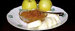 Пови́дло — густой фруктовый или ягодный продукт, получаемый путём длительного уваривания плодового пюре без добавления воды (или с минимальным её количеством) до состояния однородной массы[1]. В отличие от джема или варенья, повидло не содержит цельных кусочков фруктов и обладает плотной, пастообразной консистенцией[2].