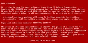 На самом деле установочный файл содержал в себе вредоносное ПО. После нескольких циклов загрузки системы программа начинала шифровать имена файлов на жёстком диске, заменяя их на случайные символы. Это делало работу с файлами практически невозможной. Злоумышленник требовал выплату в размере 378 долларов для получения лицензии или 189 долларов за годовое использование программного обеспечения, якобы разработанного компанией PC Cyborg Corporation. Деньги следовало переводить на банковский счет в Панаме[3].