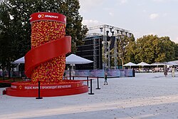 - Государственный музей изобразительных искусств имени А. С. Пушкина: традиционное изображение здания музея и подпись заменены на монограмму из заглавных букв П и М. Вертикали этих букв отсылают к колоннам главного здания музея.