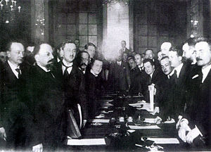 18 марта 1921 года в Риге был подписан окончательный вариант Рижского мирного договора. Подписантами договора от РСФСР, УССР и БССР были А. А. Иоффе, Я. С. Ганецкий, Э. И. Квиринг, Ю. М. Коцюбинский, Л. Л. Оболенский. Польскую сторону представляли Ян Домбский, Станислав Каузик, Эдуард Лехович, Генрих Страсбургер и Леон Василевский[4] [5].