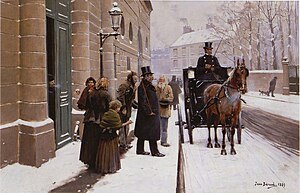 Картина Жана Беро «Выезд буржуа» иллюстрирует противоречие между воплощением добродетелей, культивируемых капиталистическим обществом, ощущением личного благополучия и социальной несправедливостью.
