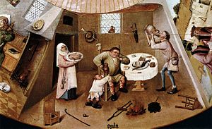 Одним из смертных грехов, впадение в который лишает человека возможности обретения загробного счастья, является чревоугодие (обжорство). На иллюстрации изображён фрагмент картины Иеронима Босха «Семь смертных грехов и четыре последние вещи».