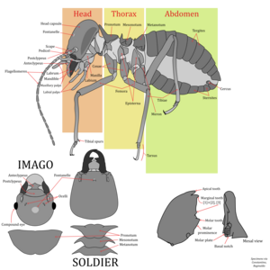 Термиты — это группа примитивных общественных насекомых, питающихся растительной пищей[3]. Половозрелые особи имеют две пары удлинённых, нежных, перепончатых крыльев, которые они сбрасывают после брачного лёта[1].