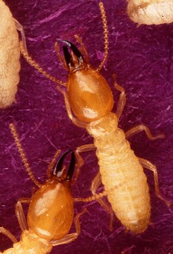 В просторечии их иногда называют «белыми муравьями» из-за светлой, зачастую белой окраски рабочих особей. От настоящих муравьёв термиты отличаются отсутствием характерной перетяжки между грудью и брюшком[3].
