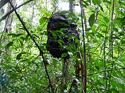 Зачастую термитники имеют форму гриба, что является адаптацией для защиты от ежедневных тропических дождей. Благодаря такой форме вода быстро стекает, предотвращая разрушение основной части термитника. Древесные гнёзда термитов обычно имеют каплевидную форму, достигают размеров арбуза, чаще всего чёрного цвета, и располагаются у основания толстых ветвей рядом со стволом. Такое высокое размещение защищает их от избыточной влаги, практически неизбежной на земле[5].