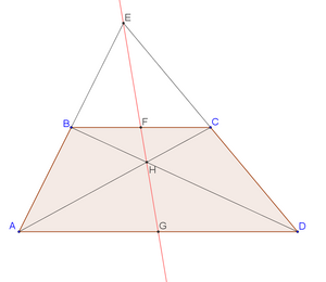 Если через точку пересечения диагоналей трапеции провести прямую, пересекающую основания, то точки пересечения её с основаниями — две из четырёх вершин параллелограмма. Все вершины этого параллелограмма лежат на сторонах трапеции по одной на каждой стороне, а стороны параллельны диагоналям данной трапеции. Два отрезка между боковой стороной трапеции и диагональю трапеции, которые диагонали отсекают от диагонали указанного параллелограмма, равны между собой[7].