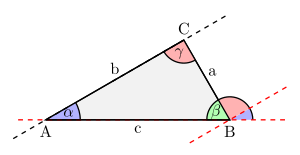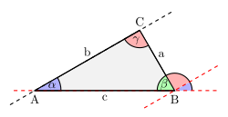 Вершины треугольника традиционно обозначают заглавными латинскими буквами A, B, C, а противолежащие им стороны — соответствующими строчными a, b, c. Три отрезка образуют в вершинах три внутренних угла; их сумма всегда равна 180°. Часть плоскости внутри сторон называют внутренностью треугольника — она учитывается, например, при вычислении площади[2][1].