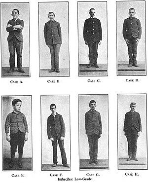 - Имбецильность — характеризуется при тяжёлой умственной отсталости (IQ в пределах 20–34), связная речь отсутствует, но пациенты могут понимать простые вербальные инструкции, а также жесты и другие формы невербальной коммуникации; характерны двигательные расстройства, ограничены возможности самостоятельного передвижения; необходимы постоянный уход и надзор. Вторая степень имбецильности характеризуется при умеренной умственной отсталости (IQ 35–49), речь характеризуется бедным словарным запасом, косноязычием, аграмматизмами; возможно освоение элементарных навыков чтения, счёта, письма, самообслуживания, а также простых трудовых навыков под руководством инструктора, однако независимое существование для таких пациентов остаётся недоступным.