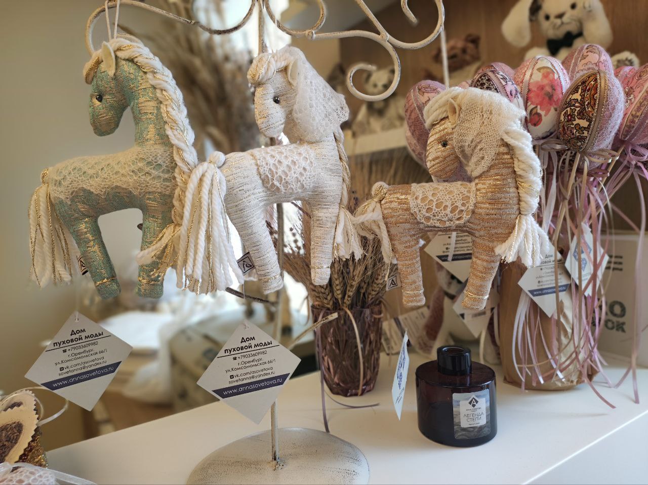 | Описание | Игрушки и талисманы представлены на витрине в Доме пуховой моды (Оренбург). | ||