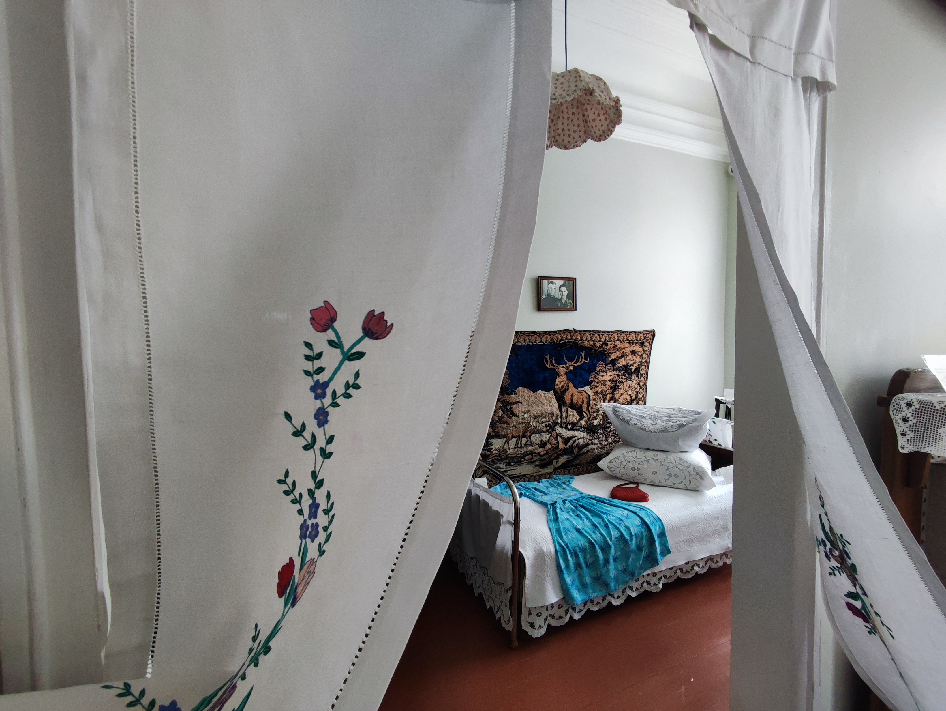 | Описание | Междверные занавески, вышитые в девичестве Валентиной Гагариной (Горячевой); кровать молодожёнов Гагариных в комнате, где они проживали в Оренбурге в 1957 году; платье Валентины, переданное в дар Дому-музею имени Юрия и Валентины Гагариных. | ||