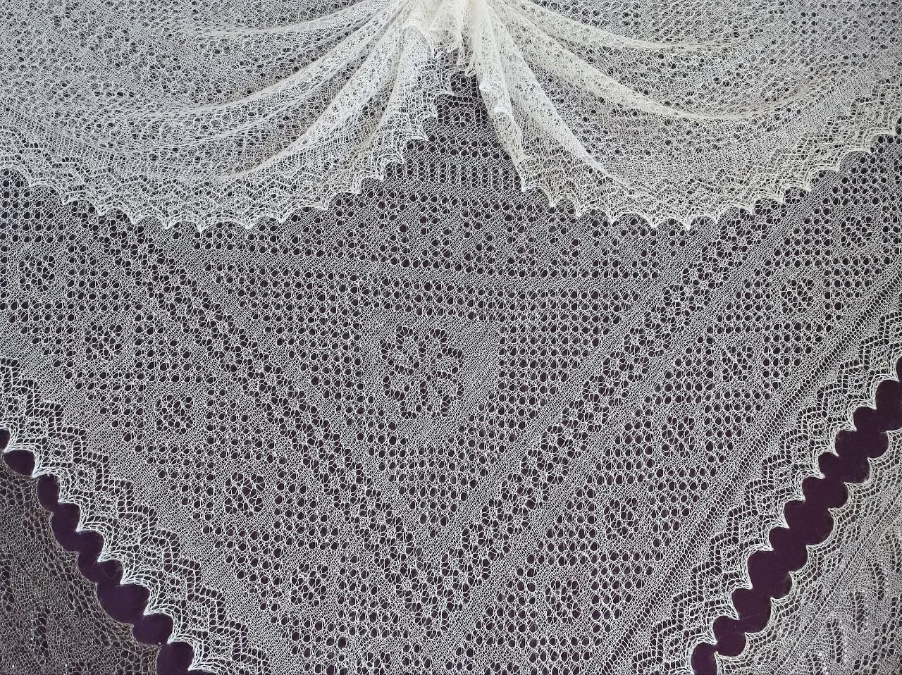 | Описание | Оренбургские паутинки белые ручной работы на витрине магазина. | ||