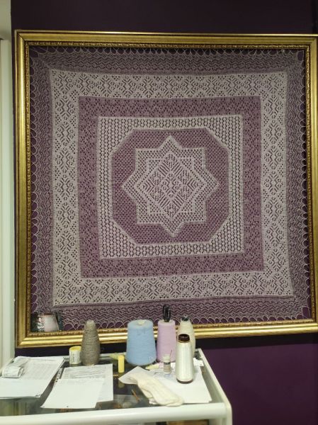 | Описание | Оренбургский пуховый платок оформлен как картина, рядом расположены нити для вязки на витрине в магазине. | ||