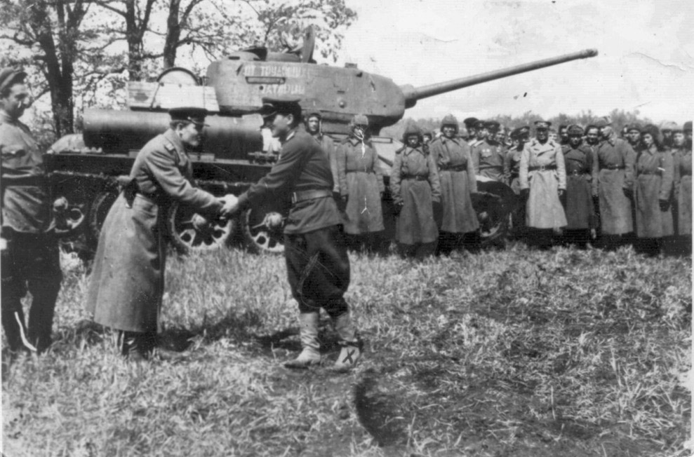 | Описание | Танковая колонна "От трудящихся Татарии". Принимает её Герой Советского Союза Халил Мамедов (отметка на левом сапоге). |