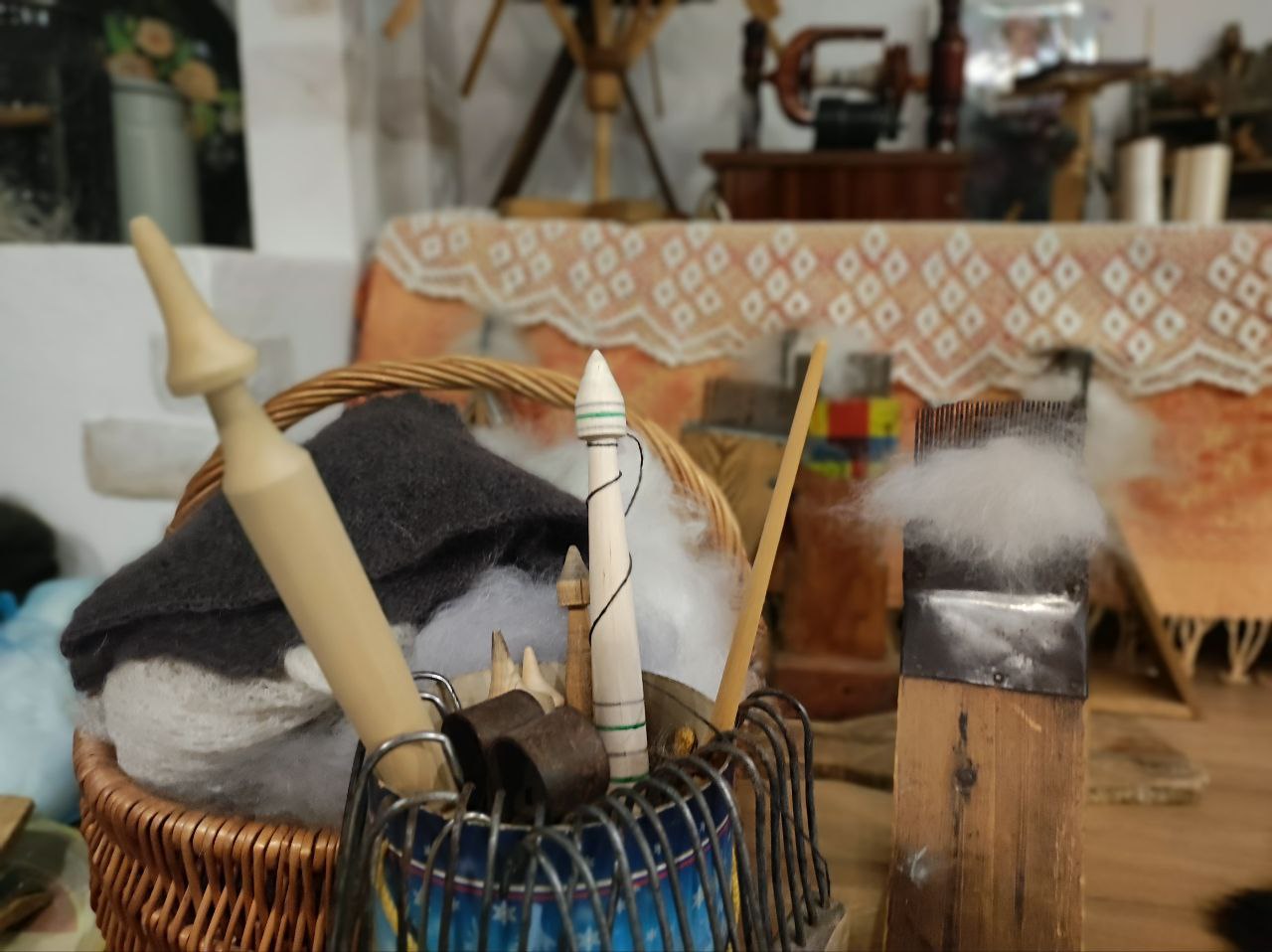 | Описание | Рабочие инструменты мастерицы Оренбургских пуховых платков на витрине магазина (веретено, инструмент для чёски пуха). | ||