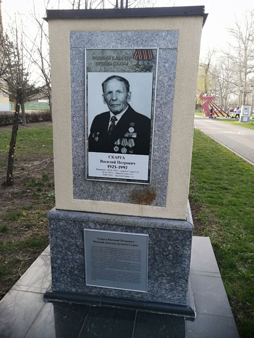| Описание | Стела с фотографией Скарги В.П. на Аллее Славы в Тихорецке | ||