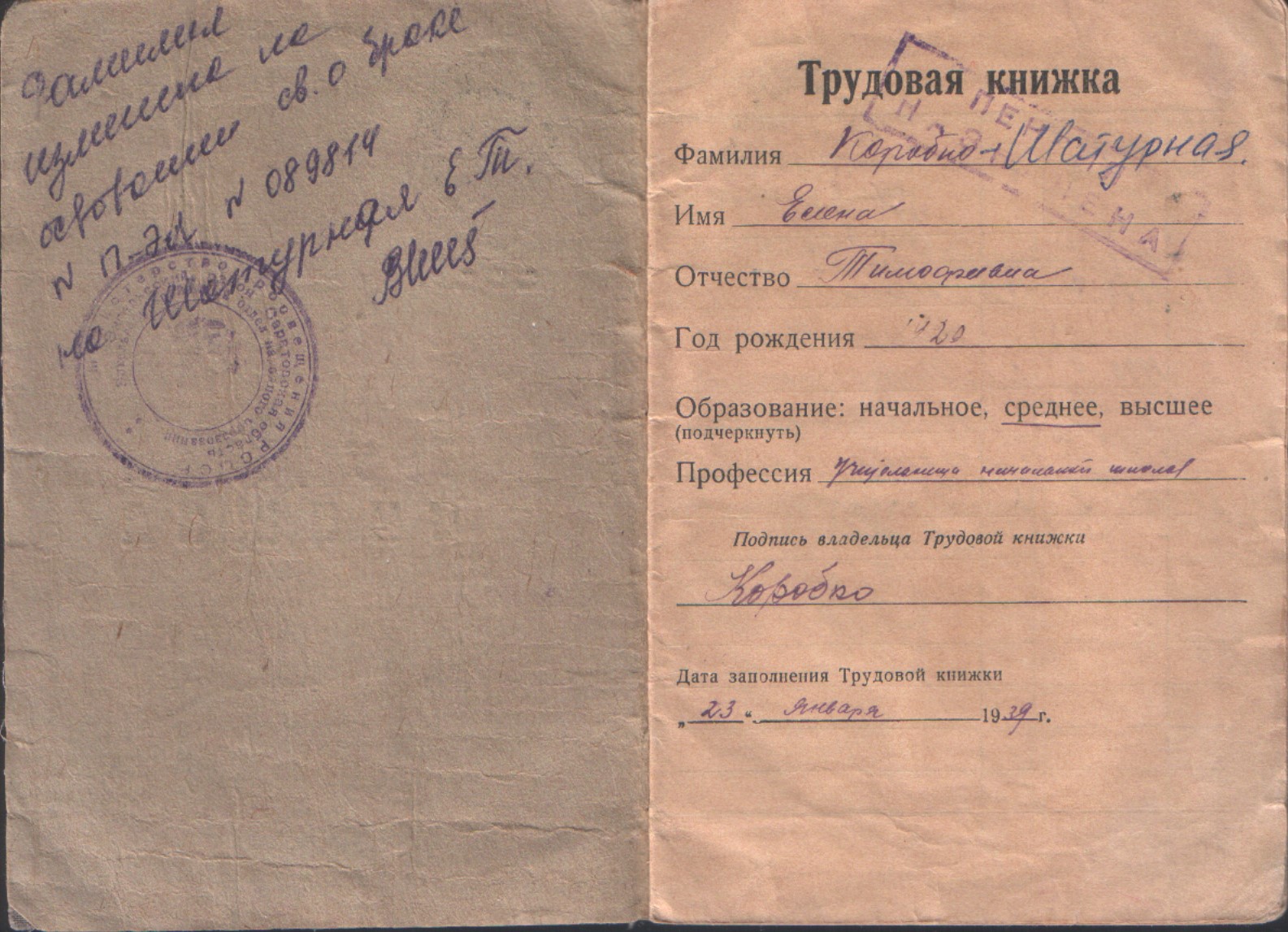 | Описание | Трудовая книжка Е. Т. Шатурной | ||