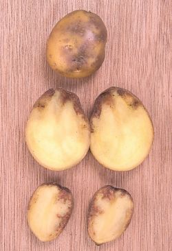 На инфицированных клубнях образуются слегка вдавленные, четко ограниченные бурые пятна, мякоть под которыми имеет ржаво-бурую окраску. Заражение клубней возможно с самых ранних этапов их формирования и до уборки урожая.