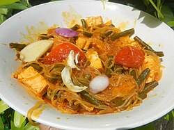 - В тайской кухне есть острый салат «Юм вун сен», который готовится на основе фунчозы, свиного фарша, чили и заправок. Лапша и свинина готовятся отдельно, а затем смешиваются с хрустящими овощами и поливаются рыбным соусом и соком лайма. Готовый салат обычно посыпают арахисом, хотя иногда используют креветки. Из-за остроты этого салата его часто подают с рисом[3].