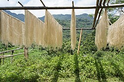 - Сформированные нити лапши размещаются на специальных подставках. Данная процедура необходима для предотвращения слипания отдельных нитей и обеспечения предварительной сушки продукта. В подвешенном состоянии лапша находится в течение приблизительно пяти часов.