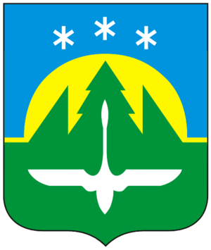«В лазоревом (синем, голубом) поле золотой безант, сопровождённый во главе девятью гонтами, сложенными по три звездообразно, и поверх безанта зелёная оконечность, из которой выходит посередине ель, а по сторонам клинья, косвенными сторонами врозь, того же цвета оконечность обрамлена летящим вверх серебряным стерхом и по сторонам от клиньев танко окаймлена кантом чёрного цвета, символизирующим нефть».