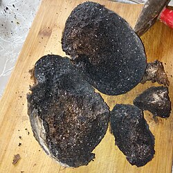 Традиционное пасхальное разговение часто начинается с употребления яиц, которые обмакивают в чёрную соль. Это блюдо отличается уникальным вкусом: аромат чёрной соли напоминает тепло тлеющих углей, острый запах сероводорода напоминает минеральные источники Кисловодска, а её хрупкие кристаллы быстро тают во рту. Эта соль прекрасно сочетается не только с яйцами, но и с отварным картофелем: рассыпчатая мякоть картофеля поглощает пепельную текстуру чёрных кристаллов, преобразуя простое народное блюдо в изысканное угощение[2].