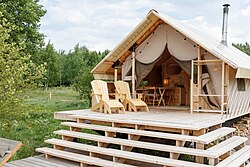 Очень популярны для размещения на природе глэмпинги (от словосочетания «гламурный кэмпинг»). Это отдых в палатке, шатре или мобильном домике со всеми удобствами и обслуживанием. По оценке туристической компании RussiaDiscovery, в России около 30—50 глэмпингов, а через 5—6 лет будет не менее 500[13].
