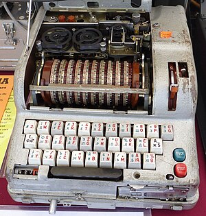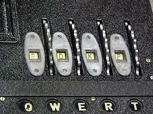 Под каждой клавишей клавиатуры находится двухпозиционный переключатель. Чтобы переключатель сработал, она должна быть полностью нажата. Клавиша также управляет шагом ротора. При каждом нажатии крайний правый ротор делает один шаг, прежде чем сработает переключатель и загорится лампа[8].