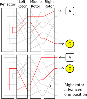 Внутри система состоит из трёх физических роторов. Каждый из них принимает букву и выдаёт другую. Буква проходит через все три ротора, отражается от «рефлектора» и снова проходит через все три ротора в обратном направлении. На табло загорается зашифрованный результат, и первый из трёх роторов поворачивается на одну позицию, изменяя результат, даже если вторая буква совпадает с первой[5].