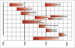 С середины XIX века в этнологии выделяются различные школы и направления, по-своему интерпретирующие многочисленные этнокультурные данные[7]: