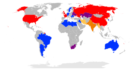 «Старые» ядерные державы, основатели Договора о нераспространении ядерного оружия (США, Россия, Великобритания, Франция, КНР) «Молодые» ядерные державы, не подписавшие Договор о нераспространении (Индия, Пакистан, КНДР) Неофициальные ядерные державы (Израиль) Страны, имевшие в прошлом ядерное оружие и добровольно отказавшиеся от него (Казахстан, ЮАР, Украина) Страны, предоставляющие свою территорию для размещения ядерного оружия других ядерных держав — членов НАТО (Германия, Италия, Турция, Бельгия, Нидерланды) Страны, предоставляющие свою территорию для размещения ядерного оружия других ядерных держав - не членов НАТО (Беларусь)